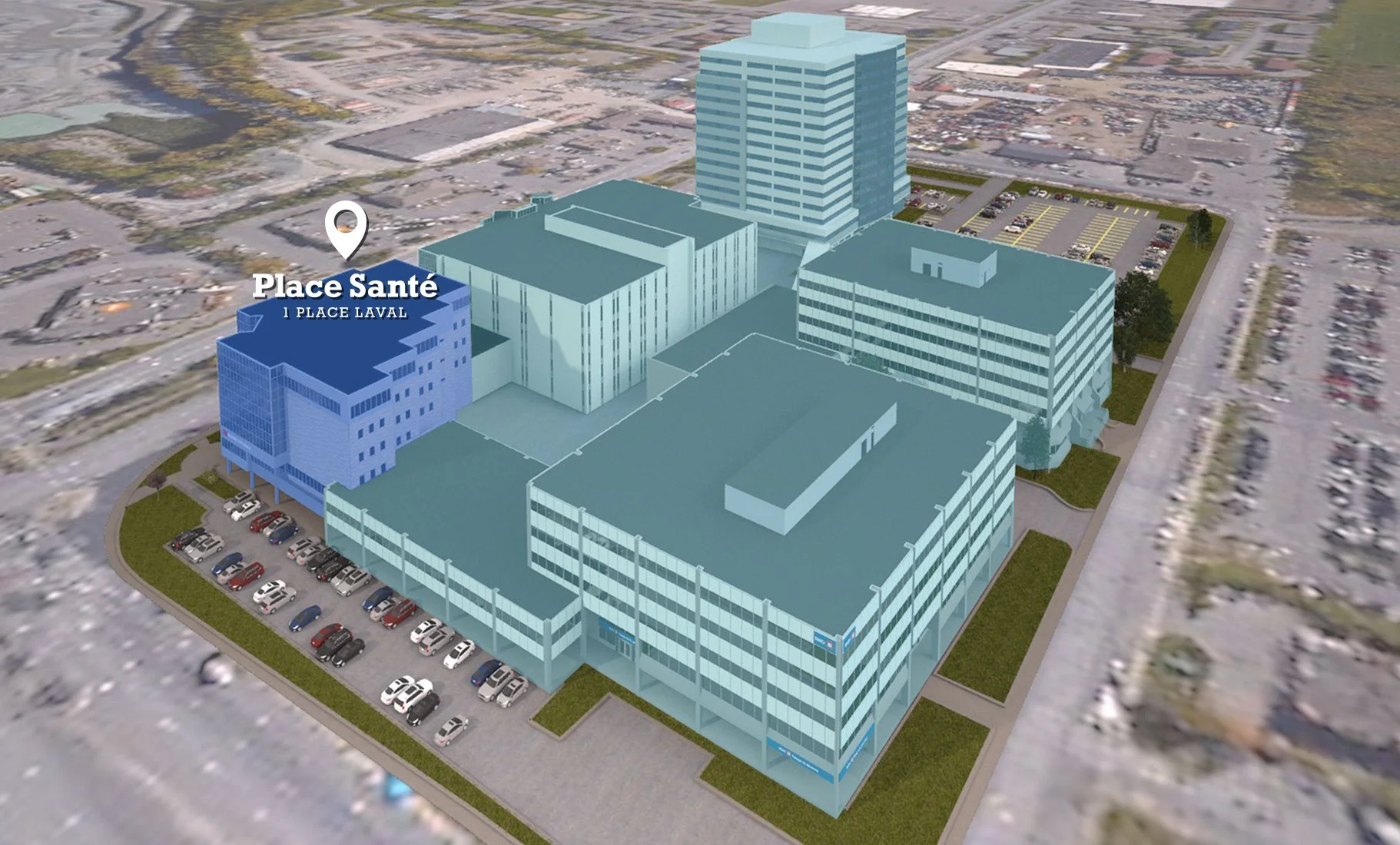 *Le 1 Place Laval est mis en valeur en bleu foncé sur la photo aérienne, tandis que les tours 2, 3, 4 et 5 apparaissent en bleu pâle, soulignant la structure complète du complexe.